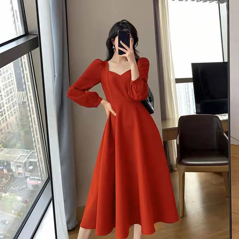 Hepburn Style Women Spring Autumn Now Vintage V-Neck Over the Knee Long Dress Temperament Lantern Sleeve Corset Elegant Dress