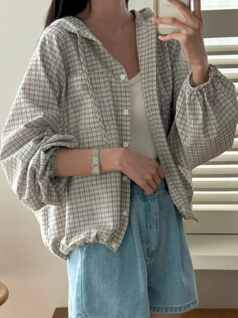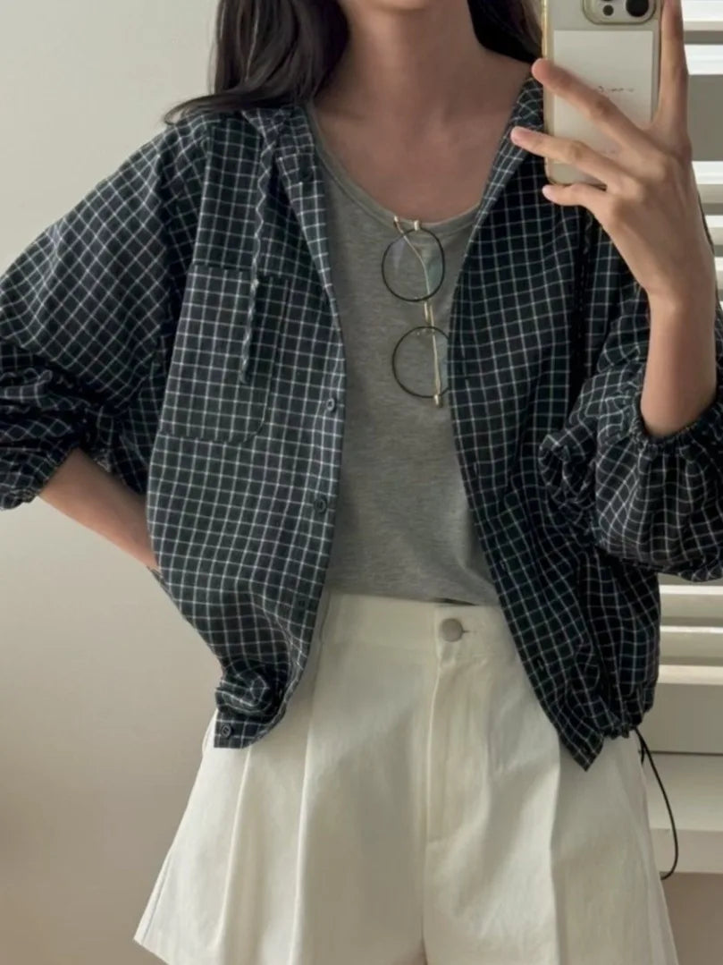 Korean Sle Lazy Plaid irt Women's Loose Casual Long Sve Dstring Hooded Top Outerwear Early Autumn Clothes