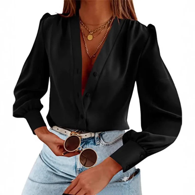 European and American Autumn and Winter New Product Solid Color Simple Temperament Long Sleeved Deep V-neck Long Sleeve Top
