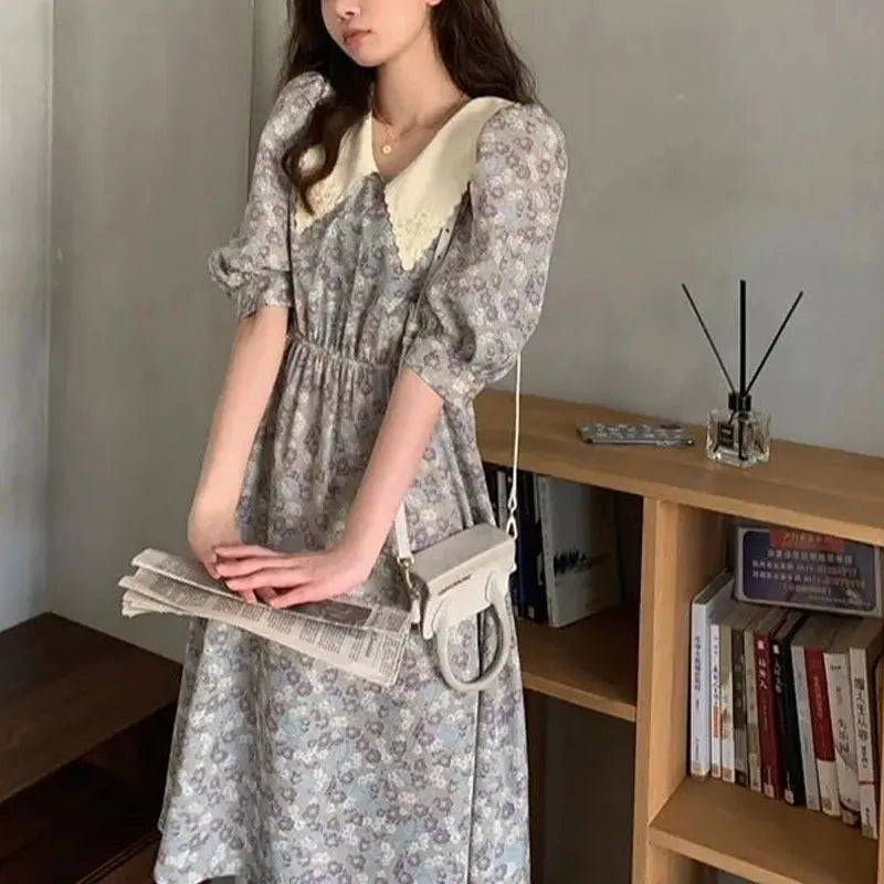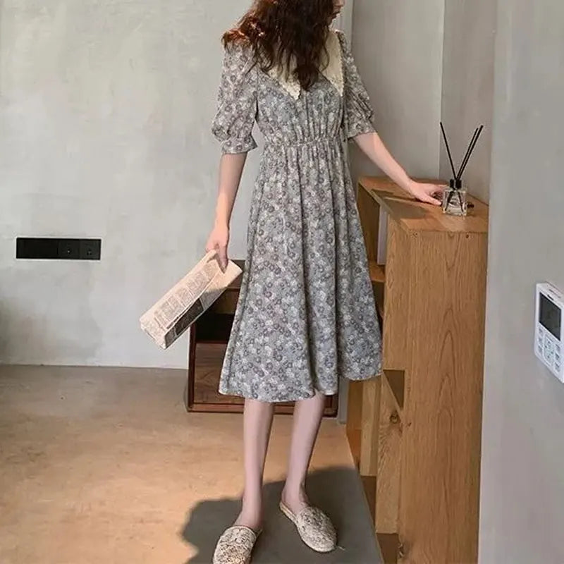 Vintage Broken Flowers Midi Dress Summer Aura Doll Collar Female Clothing Stylish Hollow Out Elegant Lantern Sleeve Dresses New