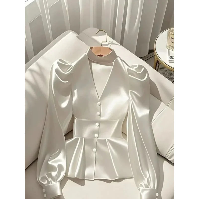 French Elegant Women's Shirt Luxury Waist Cinched White Satin Long Sleeve Shirt for Women Temperament Women's Elegant Blouses