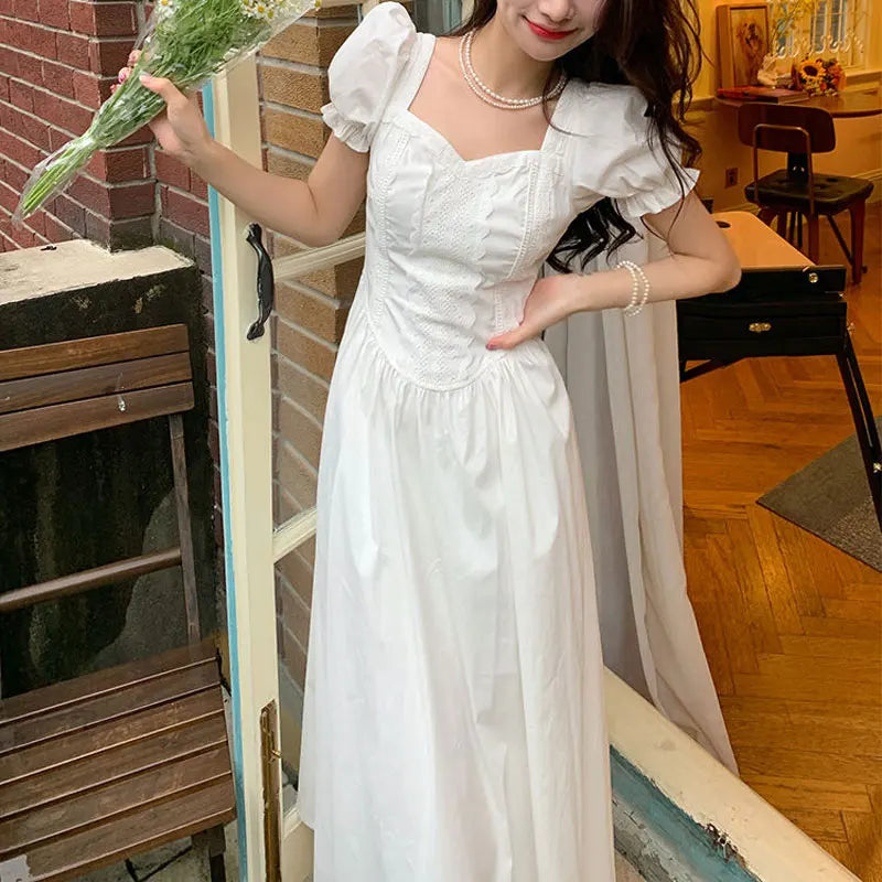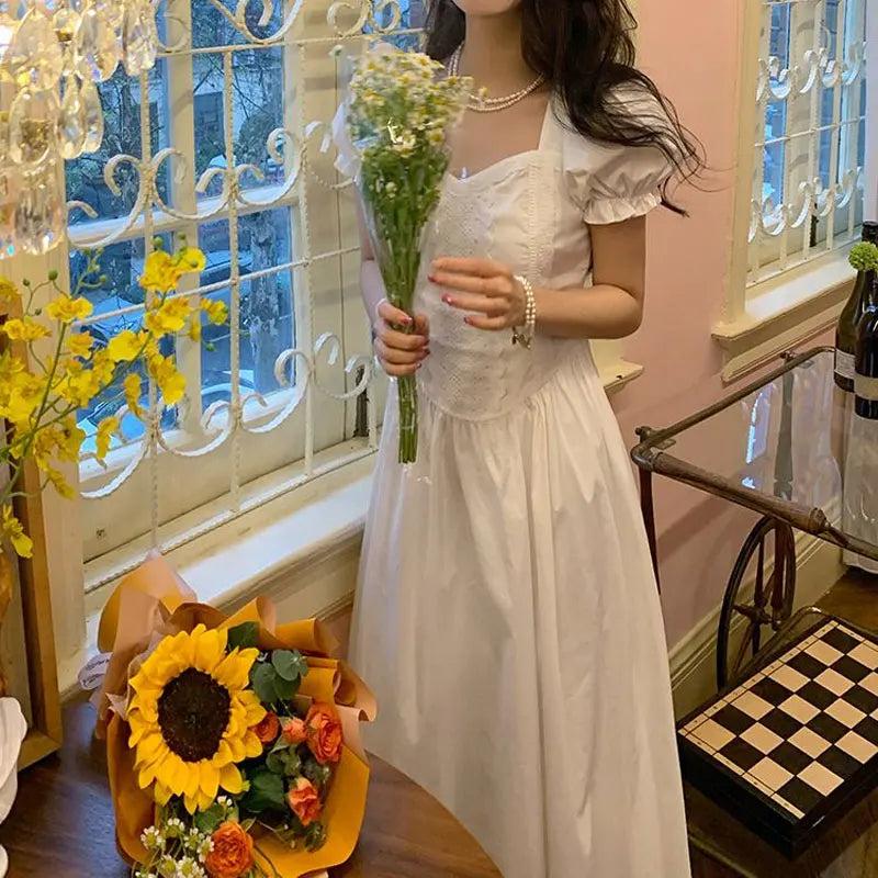Fashionable Lace Spliced Midi Dress Summer Vintage Puff Sleeve Female Clothing French Style Square Collar White Waist Dresses