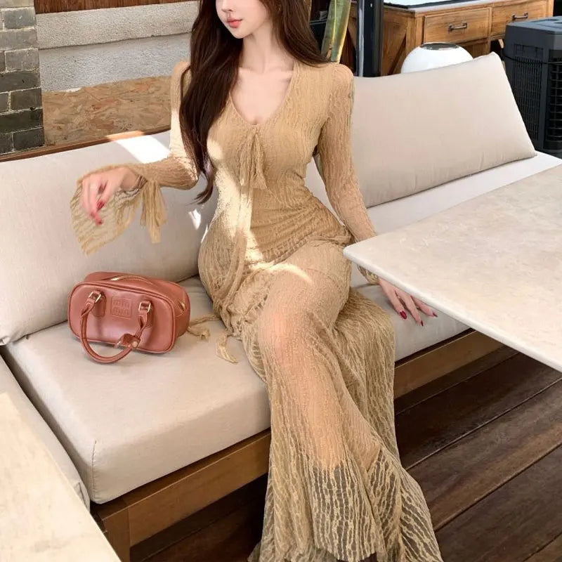 Aura Flare Sleeve Waist Dresses Spring Autumn Solid Color Women's Clothing V-Neck Stylish Drawstring Elegant Bag Hip Long Dress