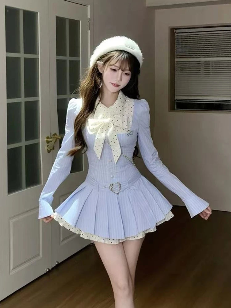 Autumn New Preppy Style Sweet Elegant Women Dresses Striped Polka Dot Polo Collar Party Dress Y2k Fashion Korean Popular Clothes
