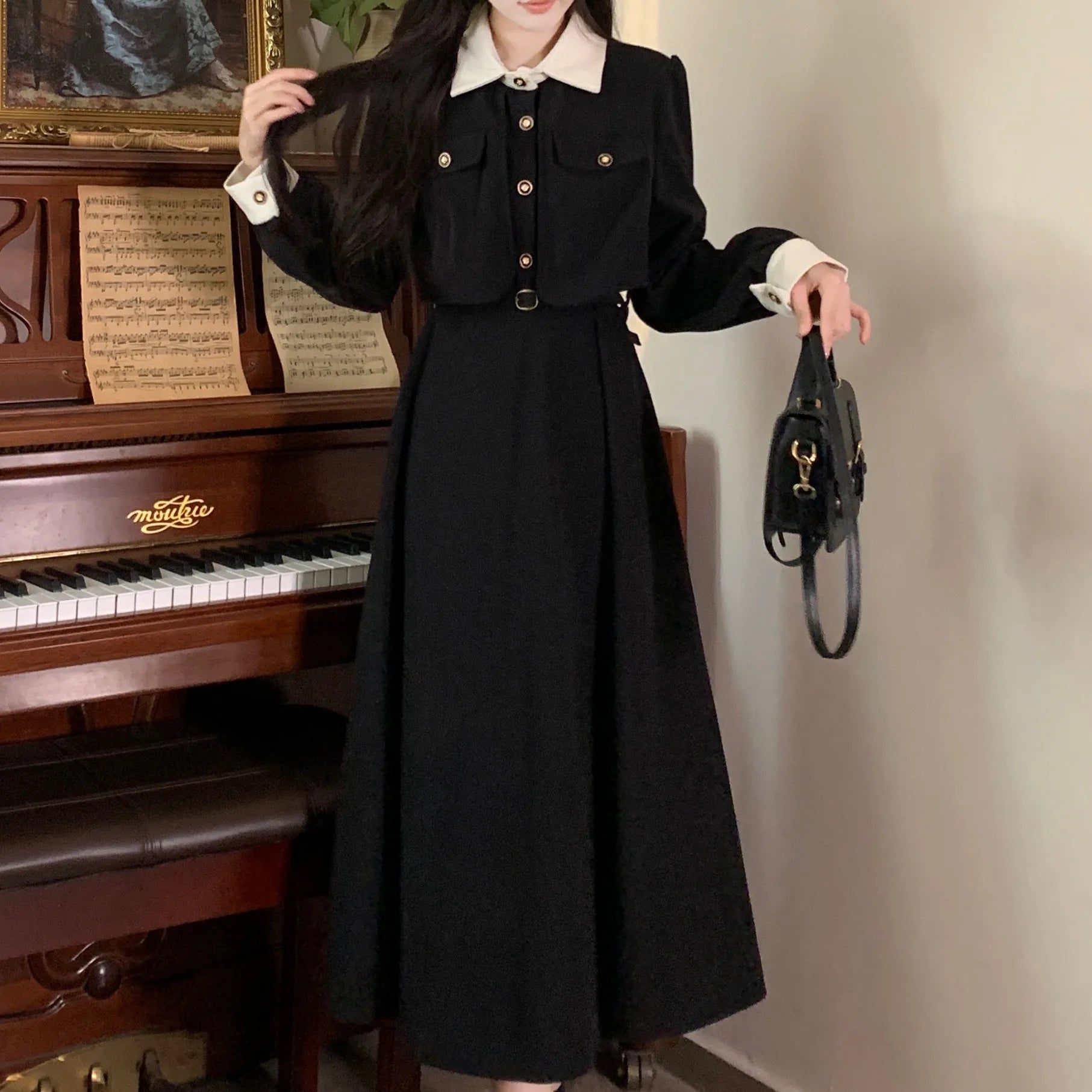 2025 New Autumn and Winter French Waist-hugging Long Skirt Hepburn Style Black Long-sleeved Shirt Dress for Women Early Autumn