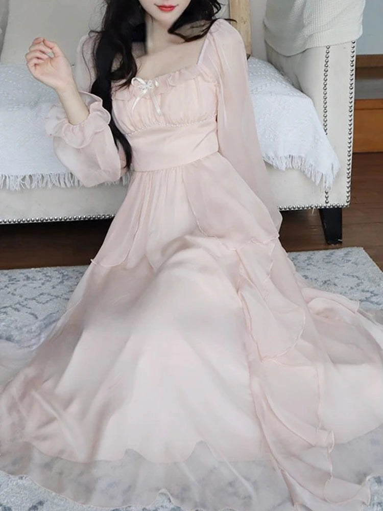 Elegant Pink Fashion YK2 Long Sleeved Two Piece Set Sweet Spring Slim Fit Dress New French Women's Beach Party Chiffon Dress