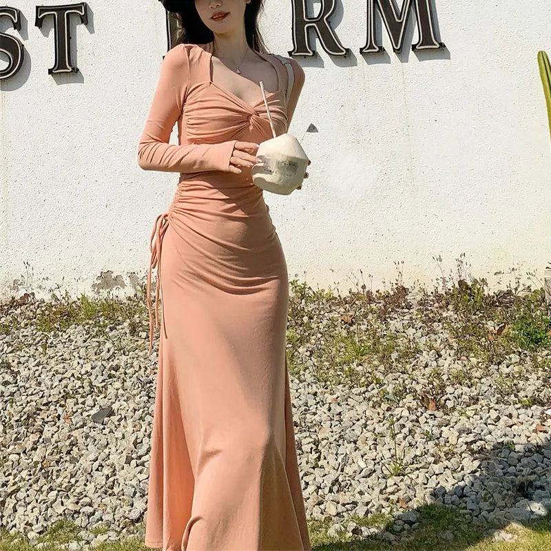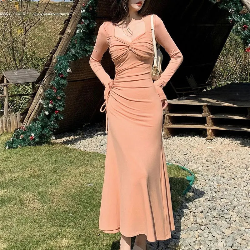 French Style Square Collar Long Dress Female Clothing Solid Color Spring Autumn Solid Color Waist Aura Folds Long Sleeve Dresses