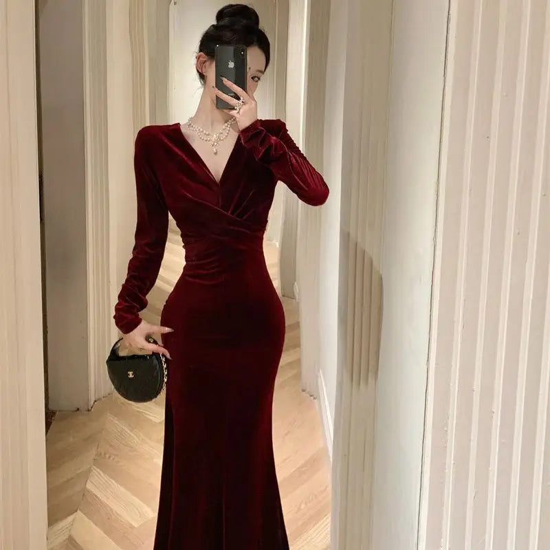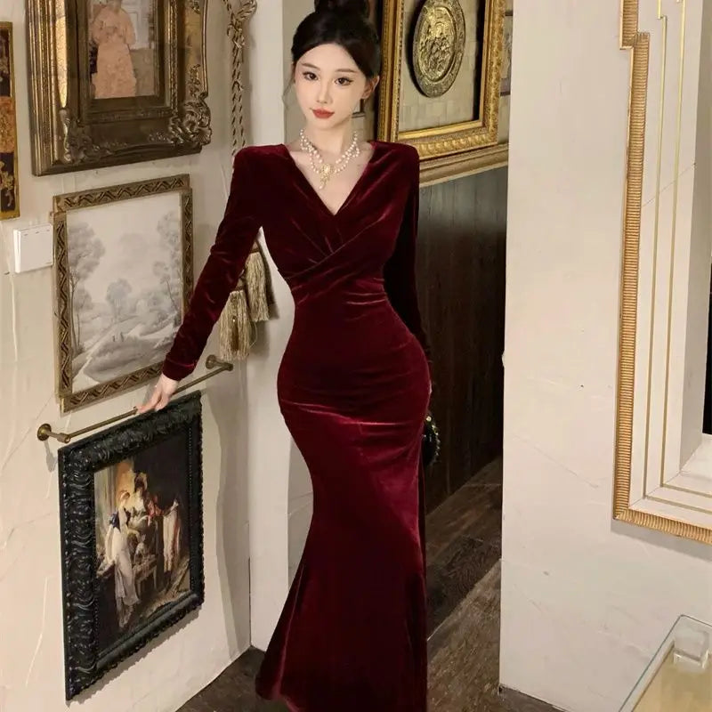2025 Autumn and Winter New High-end Style Red Spring and Autumn Gold Velvet Dress Velvet Dress Fish Tail Makes You Look Thin