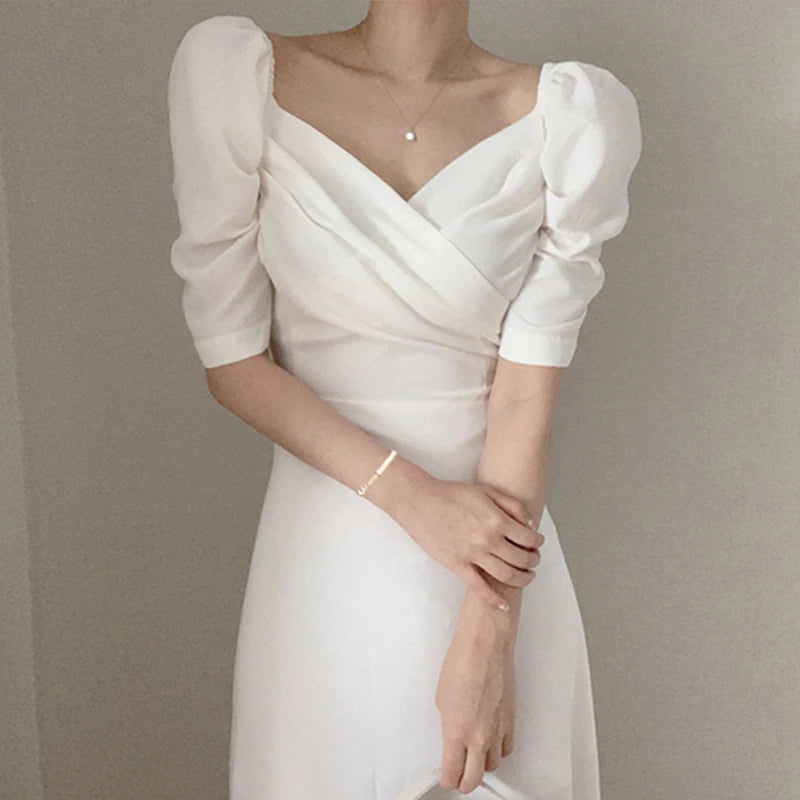 Korean French Temperament V-neck Dress Leak Collarbone Waist Cinching Slimming Bubble Sleeves Chiffon Long Dresses For Women