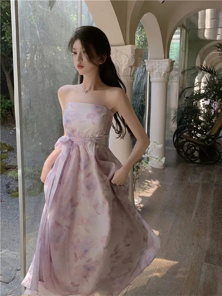 New Chinese Style Smudged Strapless Dress for Summer New Sweet Off-shoulder Waist-hugging Slim Long Skirt