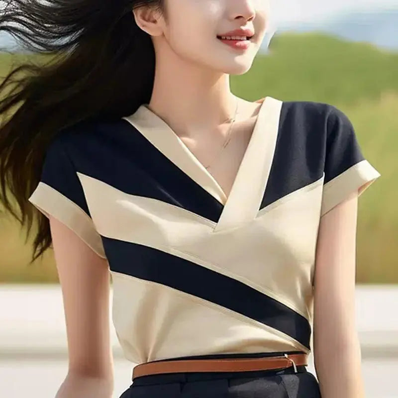 Summer New Style Beautiful Fashionable and Chic Short-sleeved Age-reducing Niche Design Commuting Contrasting Tops for Women