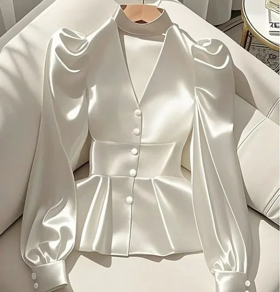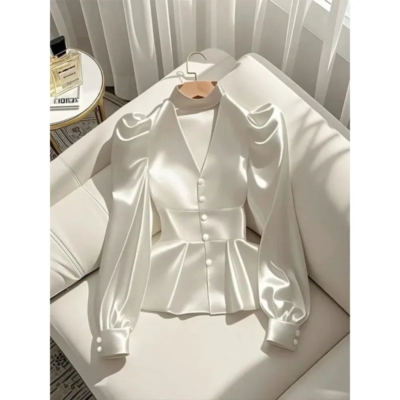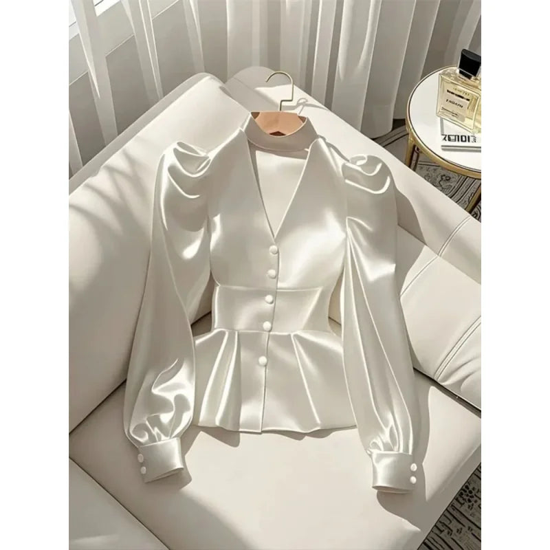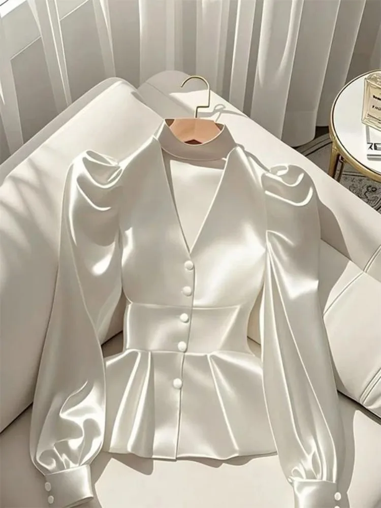 French Elegant Women's Shirt Luxury Waist Cinched White Satin Long Sleeve Shirt for Women Temperament Women's Elegant Blouses