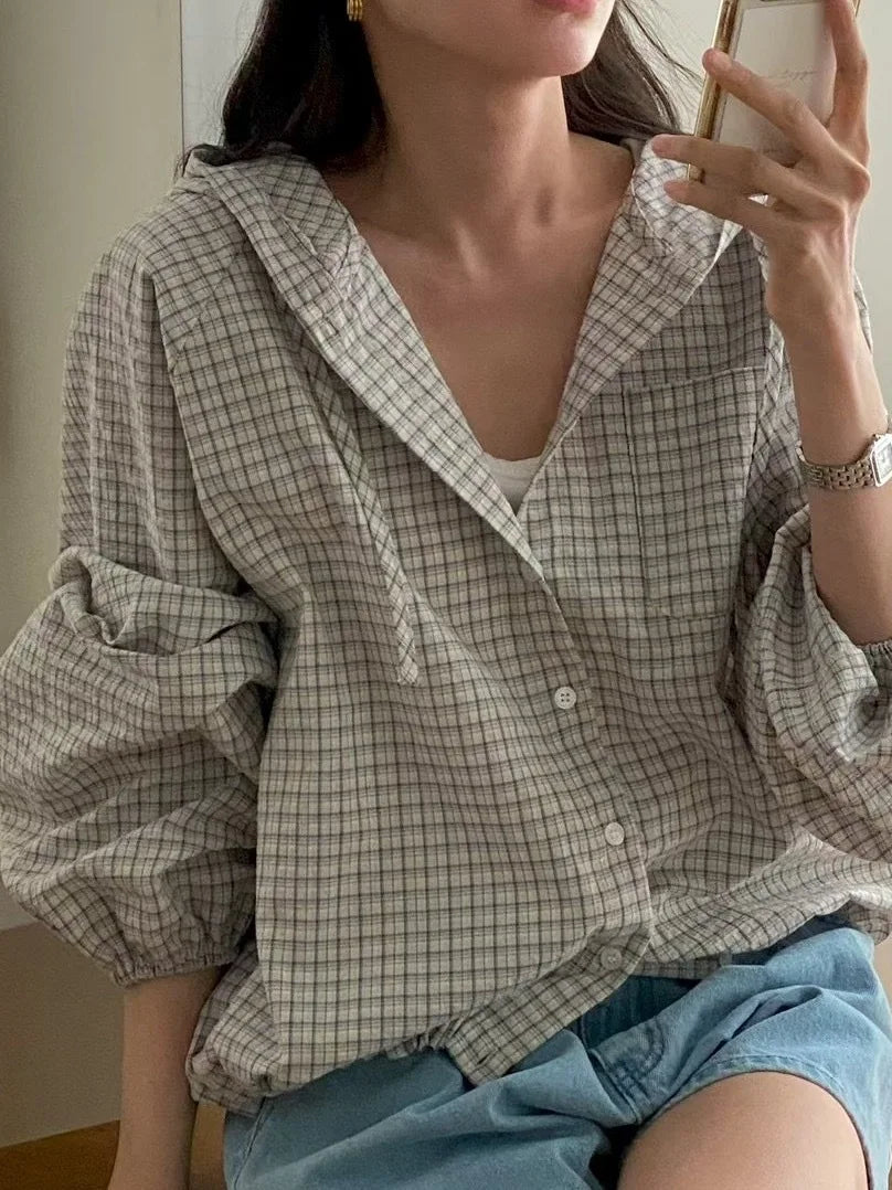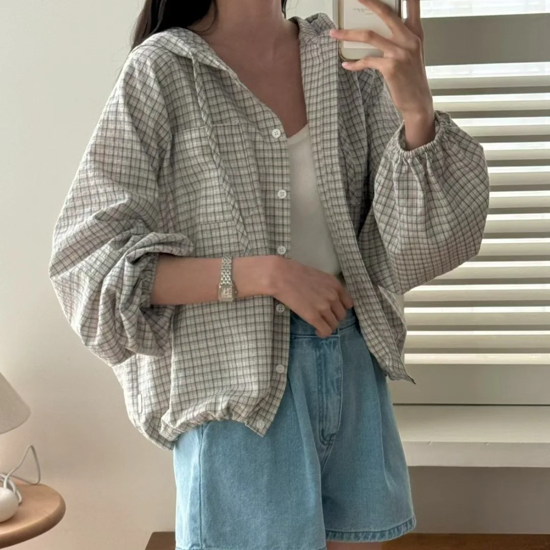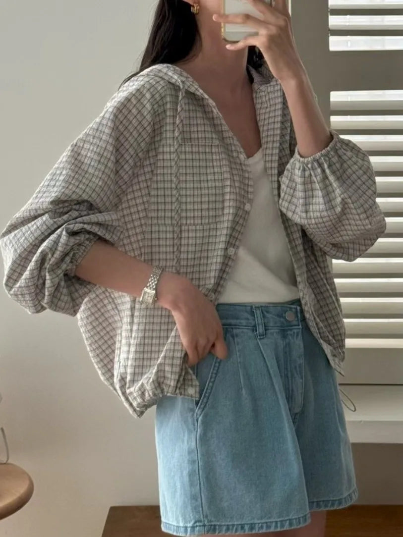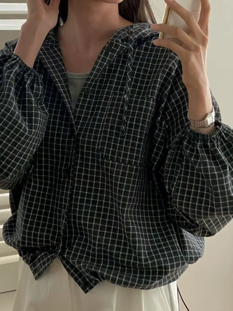 The Korean-style lazy plaid shirt features a loose fit, providing comfort and a relaxed look for everyday wear.