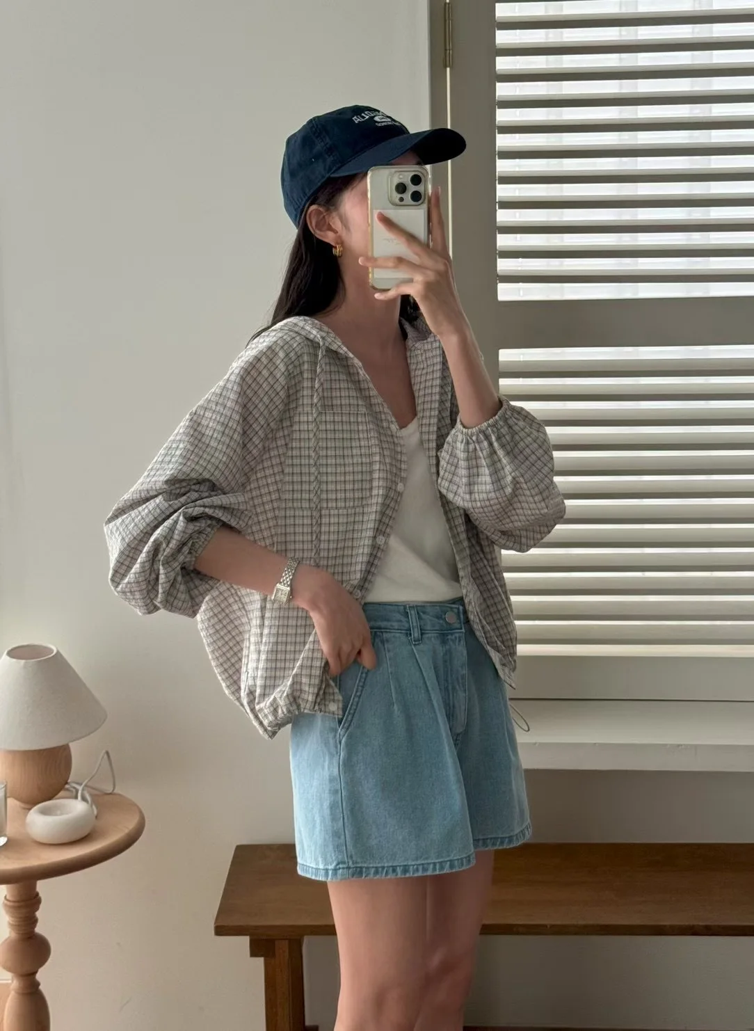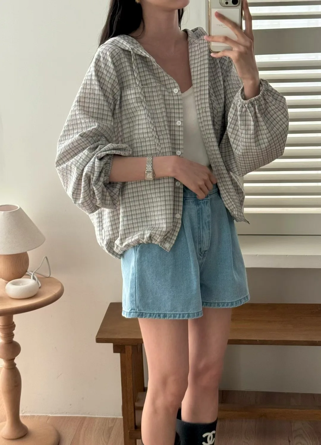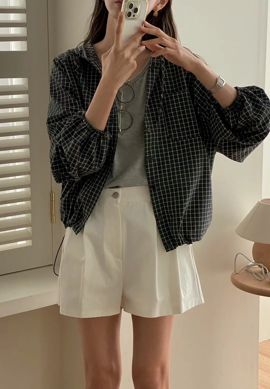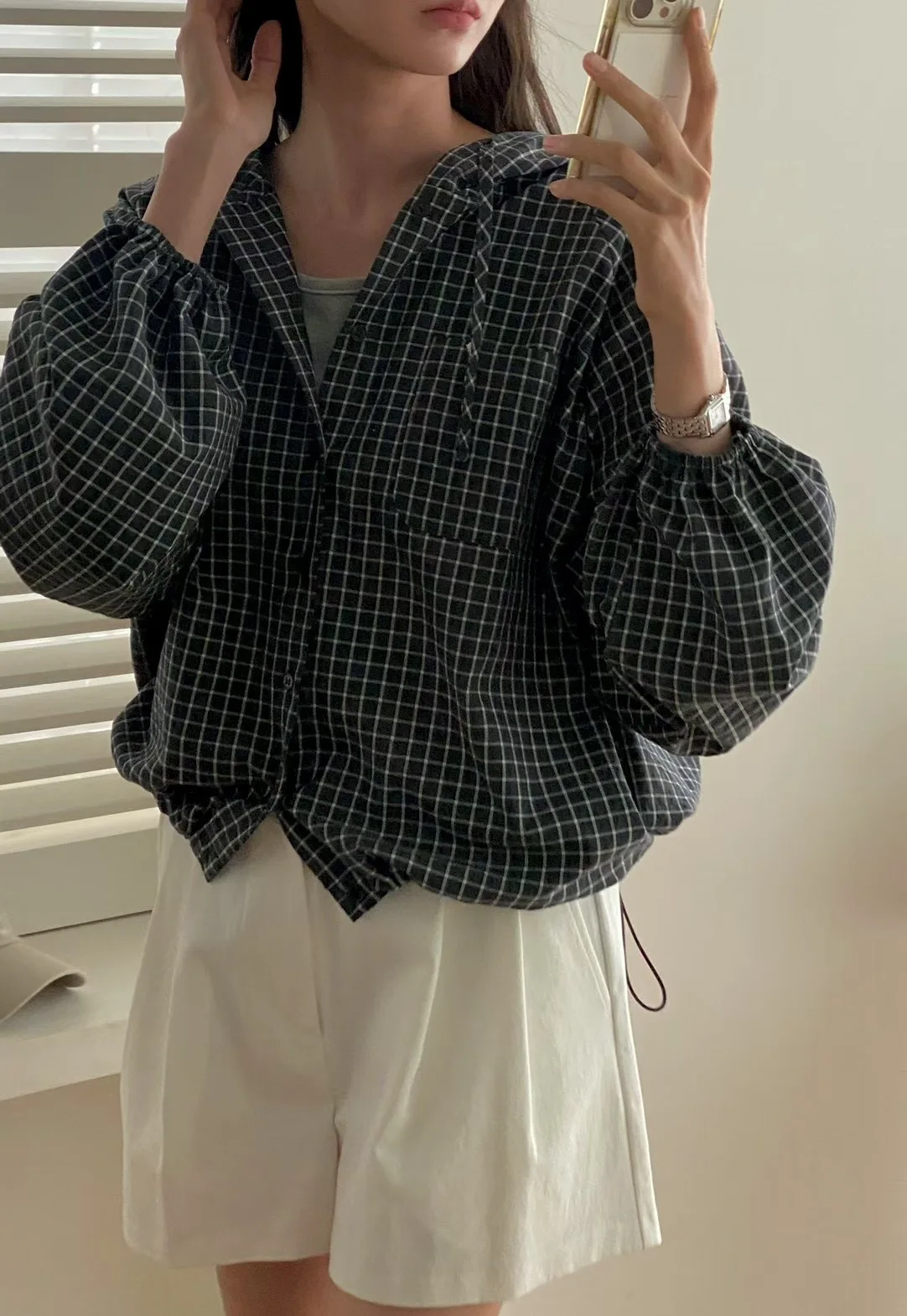 The Korean-style lazy plaid shirt features a loose fit, providing comfort and a relaxed look for everyday wear.
